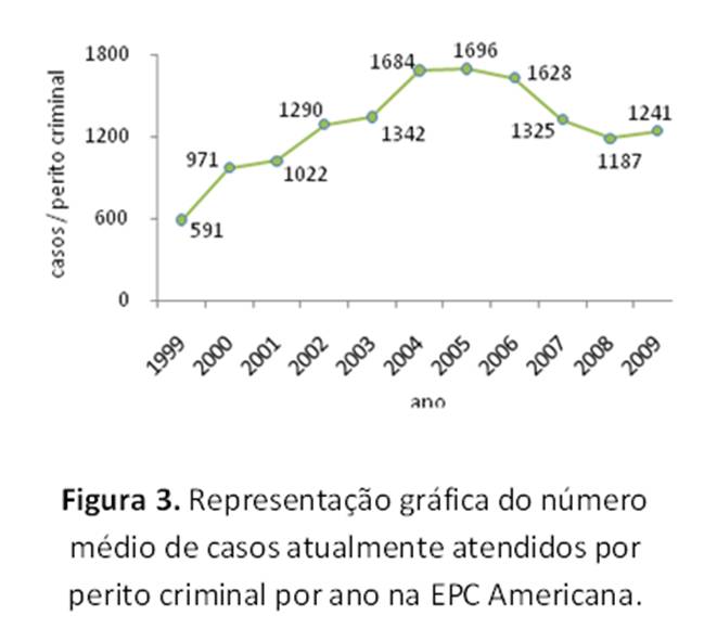 Depreende-se da figura 3 que o número de casos atendidos por perito criminal ascende a uma taxa média de 5,5% ao ano. No entanto, se a análise for restrita aos cinco últimos anos, parece emergir um padrão de número médio oscilante entre 1200 e 1600 casos/perito/ano. A observância desta tendência só é possível quando considerado o aumento do efetivo ocorrido nos anos de 2003 e 2007.Visando encontrar parâmetro para avaliar se o efetivo da EPC Americana é ou não adequado à demanda da região, buscou-se informações junto à Associação Brasileira de Criminalística (ABC). De acordo com a entidade, o número recomendado de peritos criminais deve seguir o número de habitantes da região atendida em uma proporção de 1:5000, isto é, um perito criminal para cada 5 mil habitantes.