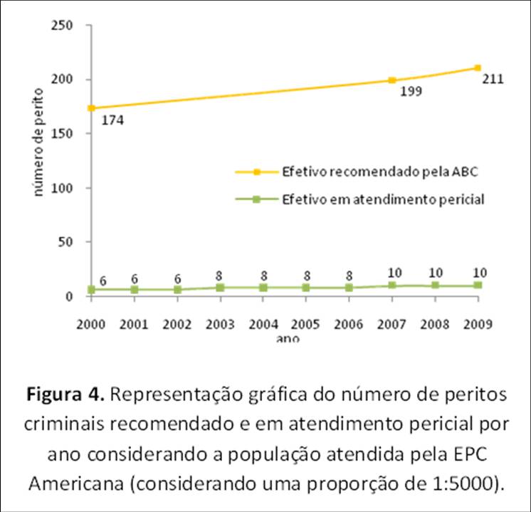 Usando o critério recomendado pela ABC, entre 2000 e 2009, o efetivo ideal para a EPC Americana seria de 20 a 29 vezes maior que o quadro de peritos criminais em atendimento pericial no período (figura 4), ou seja, 211 peritos criminais lotadas na equipe em questão (considerando os dados do ano de 2009).