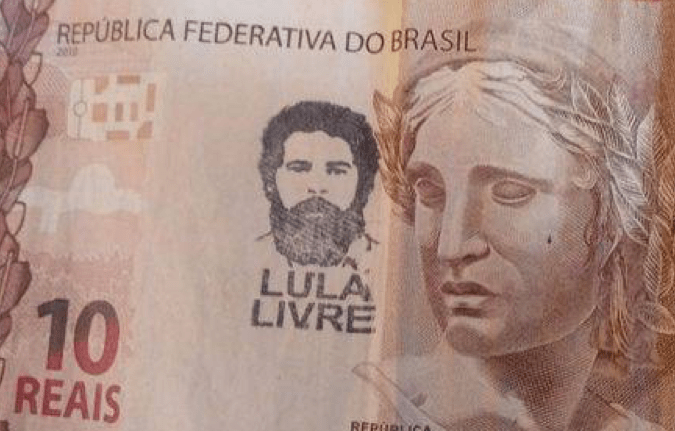 É mais ou menos isso que um grupo de pessoas ligadas ao ex-presidente Lula tem feito. Recentemente, começou a circular pelas mídias sociais um vídeo (vide abaixo) em que pessoas carimbam cédulas de Real com uma face barbada e a frase “LULA LIVRE”. Cédulas de Real representam um valor econômico circulante que, estigmatizadas por um carimbo, passam a veicular quase compulsoriamente uma ideia, tornam as cédulas panfletos que o cidadão não tem a escolha de não aceitar.