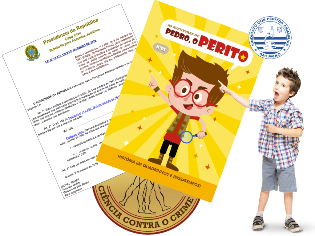 Outro evento importante para a relação entre perícia e infância que temos no presente mês de outubro é a campanha do Sindicato dos Peritos Criminais do Estado de São Paulo (SINPCRESP). A entidade lançou um gibi voltado para crianças que não apenas apresenta o trabalho dos peritos criminais, mas também orienta os pequenos sobre como agir ao se deparar com uma situação de local de crime e enfatiza a importância da preservação do local de crime.
